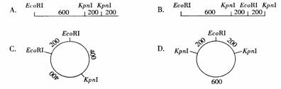 by,用Kpn1单独酶切得到400 by和600 by两种长度的DNA分子,用EcoRI,Kpnl同时酶切后得到200 by和600 by两种长度的DNA分子。该DNA分子的酶切图谱正确的是( )