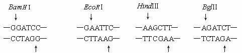 5.限制酶是一种核酸切割酶,可辨识并切割DNA分子上特定的核苷酸碱基序列。下图为四种限制酶BamHI,EcoRI,HindⅢ以及BglⅡ的辨识序列。箭头表示每一种限制酶的特定切割部位,其中哪两种限制酶所切割出来的DNA片段末端可以互补黏合?其正确的末端互补序列为何?( )