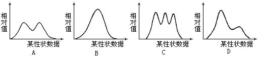 50.右图是对一个物种中两个亚种种群(种群数量较大)的某一性状测量的结果绘制的曲线图,如果将这两个亚种置于同一生态系统中,并使之随机交配而进行基因交流,在进行了相当长时间的基因交流后,下列4种根据预测的结果绘制成的曲线,你认为比较合理的是