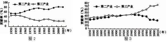 图2是我国产业对城市化的贡献率统计图,图3是世界发达国家产业对城市化的贡献率统计图。读图回答5-6题