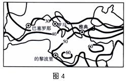 图4示意地中海地区冬雨率等值线分布(冬雨率为冬季降水量占全年降水量的百分率,单位:%)。读图,回答7-8题。