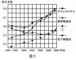 图5是我国不同产业空间集中程度及其变化趋势统计图(基尼系数越高,表明空间集中程度或专业化程度越高),读图回答9-10题。