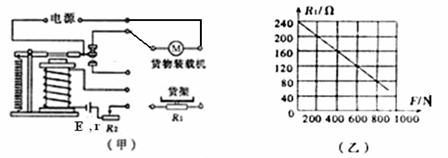 Ⅱ(12分)某同学设计了一种“自动限重器”,如图(甲)所示。该装置由控制电路和工作电路组成,其主要部件有:电磁继电器、货物装载机(实质是电动机)、压敏电阻R1和滑动变阻器R2等。压敏电阻R1的阻值随压力F变化的关系如图(乙)所示。当货架承受的压力达到限定值,电磁铁将衔铁吸下,切断电动机电源。已知控制电路的电源电动势E=6V,内阻r=2Ω,不计电磁继电器线圈的电阻。请你解答下列问题: