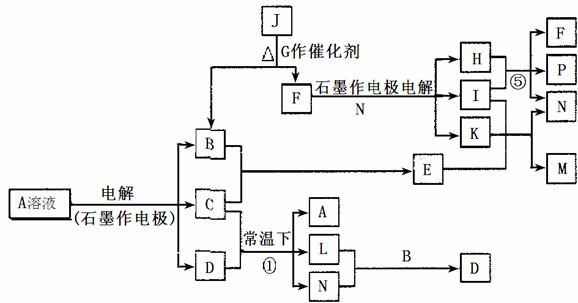 27. (14分)已知A为蓝色溶液,B、C、I、K为单质,其余均为化合物。B、L、K 常温下为无色无味气体,I为有色有刺激性气味气体。G为黑色固体,F的焰色反应显紫色(透过钴玻璃观察)。反应⑤中,产物F、P的物质的量之比为1:1。各物质转化关系如下图: