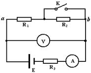 8.在如图所示的电路中,电源的电动势E恒定,内阻r = 1Ω,定值电阻R3=5Ω,电表均为理想的.当开关K 断开与闭合时,ab 段电路消耗的电功率相同.则下列说法正确的是:
