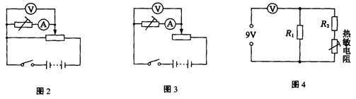 (2)在图4电路中,电源电压恒为9V,电流表读数为70 mA,定值电阻R1 = 250Ω。由热敏电阻的I - U关系曲线可知,热敏电阻两端的电压为_______V;电阻R2的阻值为______Ω