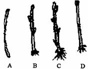 26.(12分)回答有关植物生命活动调节的下列问题:(1)下图为葡萄苗扦插的实验,插条A、B、C、D的不同情况说明如下:A无侧芽,扦插后不产生不定根;B有侧芽扦插后长出少量不定根;C有四个侧芽,扦插后长出许多不定根;D无侧芽,用吲哚乙酸处理下部分切口后,也长出不定根。回答下列问题(3分):