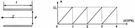 m。两极板不带电时,电子束将沿两极板之间的中线通过。加在两板间电压u随时间t变化的u-t图线如图所示。设两板间的电场可看作是均匀的,且两板外无电场。如果所加电压的最大值U0超过某一值Uc时,将开始出现以下现象:电子束有时能通过两极板,有时间断不能通过。