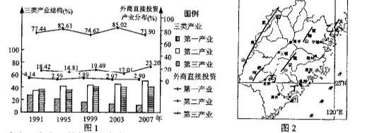 福建是中国最早实行对外开放的省份之一,吸收外资起步较早。图1是“i99l-2007年福建三类产业结构比较与外商直接投资的产业分布图”,图2为福建区域图。据此回答1~3