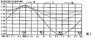 图4为我国甲、乙、丙三地2007年10月1日至2008年9月30日,日出时刻变化曲线图,读图,完成8-10题。