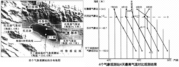 材料一:吐鲁番地区四个气象观测站的分布图和四个气象观测站4天最高气温对比观测结果图w.w.^w.k.&s.5*
