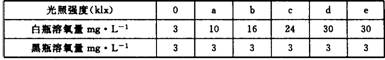 5.某研究小组从当地一湖泊的某一深度取得一桶水样,分装于六对黑白瓶中(白瓶为透明玻璃瓶,黑瓶为用不透光的黑布罩住的玻璃瓶),剩余的水样测得原初溶解氧的含量10 mg·L-1。当它们分别置于六种光照强度下,24 h后测得六对黑白瓶中的溶解氧的含量,记录数据如下: