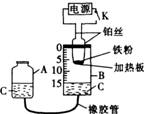 ①检查装置的气密性;②加入液体C,调整A的高度,使B中液面位于刻度15.O cm处;③将过量的铁粉平铺在加热板上(加热板上的铁粉可与B容器中的气体充分接触),盖紧容器;④通电加热铁粉,待充分反应后,冷却到原来的状况.调整A的高度使A、B中的液面保持水平,记录液面的刻度.