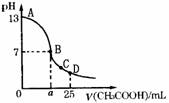 11.25℃时,在25mL 0.1mol·L-1 NaOH溶液中,逐滴加入0.2mol·L-1 CH3COOH溶液,溶液pH的变化曲线如下图所示。下列分析中正确的是