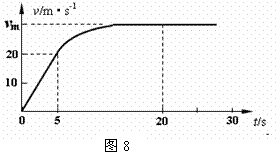23.(16分)一新车型赛车在水平专用测试道上进行测试,该车总质量为m =1×103kg,由静止开始沿水平测试道运动,传感设备记录其运动的速度-时间图象(v-t图象)如图8所示.该车运动中受到的摩擦阻力(含空气阻力)恒定,且摩擦阻力跟车对路面压力的比值为μ=0.2. 赛车在0-5s的v-t图象为直线,5s末起达到该车发动机的额定牵引功率并保持该功率行驶,在5s-20s之间,赛车的v-t图象先是一段曲线,后为直线.取g=10m/s2,试求:
