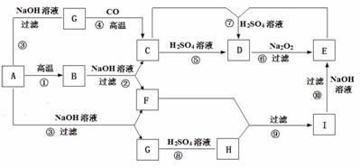 28.(14分)已知A是由三种常见元素组成的两种物质的混合物,下图表示了A以及其它物质之间的转化关系,有部分反应产物未在图中标出,反应①和④都可以应用于工业生产。各物质中,A、B、C、E、G、I均是固体,其余是溶液,E为红褐色,I转化为E的过程中质量减小。