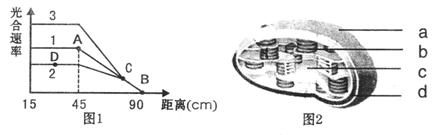 30.(20分)Ⅰ、某学校生物兴趣小组用依乐藻进行光合作用的实验,他们将一枝依乐藻浸在加有适宜培养液的大试管中(室温20℃),可观察到光下枝条放出气泡。他们以白炽灯作为光源,移动白炽灯使之与大试管的距离不同,结果如图1中曲线1所示。请回答: