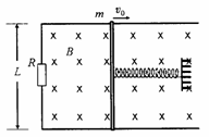 22.如图所示,固定的水平光滑金属导轨,间距为L,左端接有阻值为R的电阻,处在方向竖直、磁感应强度为B的匀强磁场中,质量为m的导体棒与固定弹簧相连,放在导轨上,导轨与导体棒的电阻均可忽略.初始时刻,弹簧恰处于自然长度,导体棒具有水平向右的初速度v0。在沿导轨往复运动的过程中,导体棒始终与导轨垂直并保持良好接触.