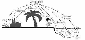 ⑵下图是自然界中氧的部分循环示意图。从①-⑥中选择序号填空,消耗氧气的有__________________,产生氧气的有_________________。