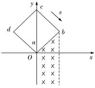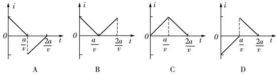 如图所示,在坐标系xOy中,有边长为a的正方形金属线框abcd,其一条对角线ac和y轴重合、顶点a位于坐标原点O处。在y轴的右侧的Ⅰ、Ⅳ象限内有一垂直纸面向里的匀强磁场,磁场的上边界与线框的ab边刚好重合,左边界与y轴重合,右边界与y轴平行。t=0时刻,线圈以恒定的速度v沿垂直于磁场上边界的方向穿过磁场区域。取沿a→b→c→d→a的感应电流方向为正,则在线圈穿越磁场区域的过程中,感应电流i随时间t变化的图线是( )