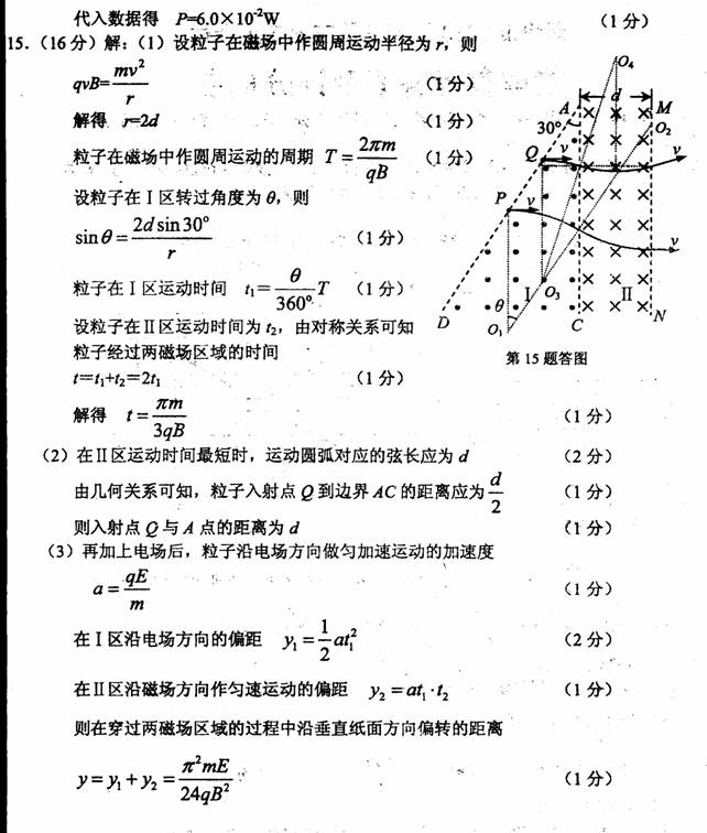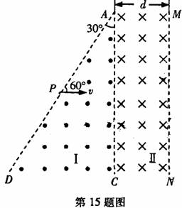 15.(16分)如图所示的空间分为I、Ⅱ两个区域,边界AD与边界AC的夹角为300,边界AC与MN平行,I、Ⅱ区域均存在磁感应强度大小为B的匀强磁场,磁场的方向分别为垂直纸面向外和垂直纸面向里,Ⅱ区域宽度为d,边界AD上的P点与A点间距离为2d.一质量为m、电荷量为+q的粒子以速度v=2Bqd/m,