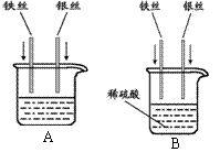 (2)小明同学设计了如右图所示的A、B两个实验(已将铁丝和银丝表面打磨)。