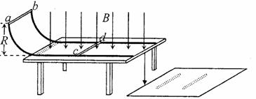 开始时棒cd静止在水平直导轨上,棒ab从圆弧顶端无初速度释放,进入水平直导轨后与棒cd始终没有接触并一直向右运动,最后两棒都离开导轨落到地面上。棒ab与棒cd落地点到桌面边缘的水平距离之比为1:3。求: