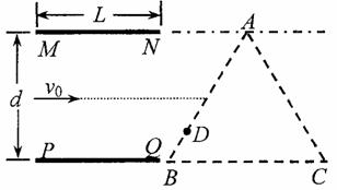 如图所示,两块平行金属板MN、PQ水平放置,两板间距为d、板长为L,在紧靠平行板右侧的等边三角形区域内存在着匀强磁场,磁场方向垂直纸面向里,三角形底边BG与PQ在同一水平线上,顶点A与MN在同一水平线上。