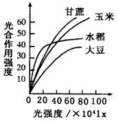 农业上为了充分利用土地和光能,可以采用间作的做法(即两种或多种农作物间行种植),下图是几种常见农作物的光合作用强度和光照强度的关系,根据下图和已学知识,请指出下列哪一选项中的两种农作物可以采用间作的做法并可能获得较大的成功