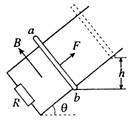 21.两根光滑的金属导轨,平行放置在倾角为θ的斜面上,导轨的左端接有电阻为R,导轨自身的电阻可忽略不计,斜面处在一匀强磁场中,磁场方向垂直于斜面向上、质量为m、电阻可不计的金属棒ab,在沿着斜面,与棒垂直的恒力F的作用下沿导轨匀速上滑,并上升h高度,如图所示,在这过程中