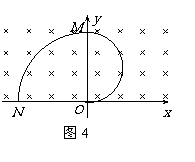 如图4所示,在x轴上方的空间存在着垂直于纸面向里的匀强磁场,磁感应强度的大小为B。许多相同的离子,以相同的速率v,由O点沿纸面向各个方向(y>0)射入磁场区域。不计离子所受重力,不计离子间的相互影响。图中曲线表示离子运动的区域边界,其中边界与y轴交点为M,边界与x轴交点为N,且OM =ON =L。由此可判断