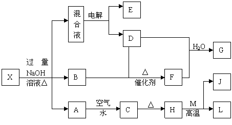 (15分)有一化合物X,其水溶液为浅绿色,可发生如下的转化关系(部分反应物、生成物从略)。其中B、D、E、F均为无色气体,M、L为常见的金属单质,C为难溶于水的红褐色固体。在混合液中加入BaCl2溶液可生成不溶于稀盐酸的白色沉淀,H和M反应可放出大量的热。