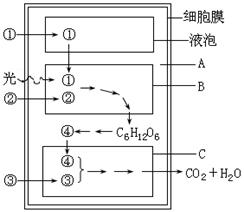 示意图。其中A、B、C代表细胞结构,①、②、③、