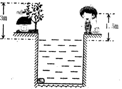 (2)(10分)一小孩站在宽6m的河边,在他正对面的岸边有一距离河面高度为3m的树,树的正下方河底有一块石头,小孩向河面看去,同时看到树顶和石头两者的像且重合.若小孩的眼睛离河面高为1.5m,如图,河水的折射率为4/3,试估算河水深度.