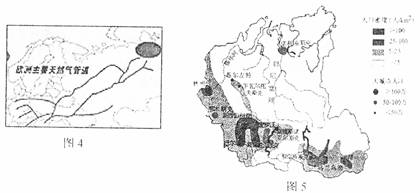 目前,欧洲约四分之一的天然气来自俄罗斯。图4为俄罗斯通往欧洲的天然气管道分布图,图5为俄罗斯一重要天然气区的人口分布图。读图回答7-9题。