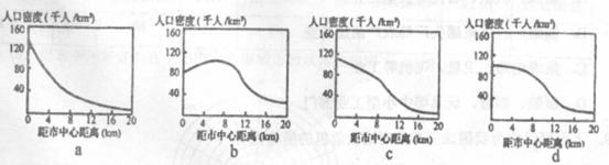 读某城市不同时期人口密度与距市中心距离关系图,回答7-8题。