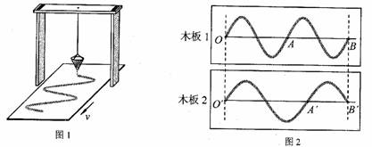 (1)图1是演示简谐运动图象的装置,它由一根较长的细线和一个较小的沙漏组成。当沙漏摆动时,若将沙漏下方的木板匀速拉出,漏出的沙在板上会形成一条曲线。通过对曲线的分析,可以确定沙漏的位移随时间变化的规律。图2是同一个沙漏分别在两块木板上形成的曲线。