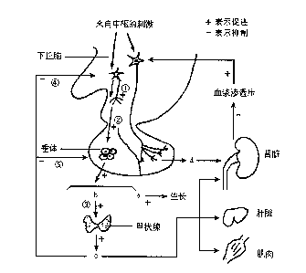 垂体除分泌生长激素外,还通过分泌[b] 来调节甲状腺的活动,由其释放的[d] ,作用于肾脏,使尿量减少来调节人体内的