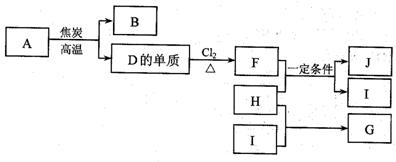 (14分)化合物A是制玻璃的主要原料之一。常温下,化合物B、H、I为气体,B不溶于水,H、I易溶于水,H的水溶液呈碱性,I的水溶液呈酸性。D元素是地壳中含量仅次于氧的非金属元素。化合物J是一种可用于制造发动机的新型无机非金属材料,其相对分子质量为140,其中D元素的质量分数为60%。上述物质间的转化关系如图所示。