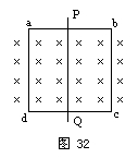 (8分)固定在匀强磁场中的正方形导线框abcd各边长为L,其中ab是一段电阻为R的均匀电阻丝,其余三边均为电阻可忽略的铜线,磁感应强度为B,方向垂直纸面向里,现有一段与ab完全相同的电阻丝PQ架在导线框上,如图32所示,以恒定的速度v从ad滑向bc,当PQ滑过1/3的距离时,通过aP段电阻丝的电流强度是多大?方向如何?