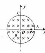 (10分)在以坐标原点O为圆心、半径为 r的圆形区域内,存在磁感应强度大小为B、方向垂直于纸面向里的匀强磁场,如图所示。一个不计重力的带电粒子从磁场边界与x轴的交点A处以速度v沿-x方向射入磁场,恰好从磁场边界 y轴的交点C处沿+y方向飞出.