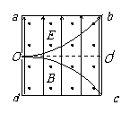18.(10分)正方形abcd内有方向如图的场强为E的匀强电场和磁感应强度为B的匀强磁场。质子流从ad边的中点O以初速度v0,沿着与ab平行的方向射入正方形区域。若撤去匀强磁场,质子将达到b点;若撤去匀强电场,质子将打到c点。求:⑴E∶B ⑵当匀强电场和匀强磁场同时存在时,为使质子沿原方向射入后能做直线运动而打到bc边的中点O/,其初速度应调整为v0的多少倍?
