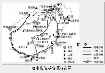 3.地处我国南部的热带地区,有独特的热带风光;旅游资源丰富,拥有地质地貌、水文(海洋)、生物(热带森林)等自然旅游资源,海南省属于华南妈祖文化区,海洋文化特点鲜明,具有独特人文旅游资源。(5分)
