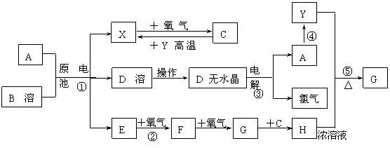 59、(江苏省江浦高级中学2010届高三模块复习,16)已知A为常见金属,X、Y为常见非金属,X、E、F、G常温下为气体,C为液体,B是一种盐,受热极易分解,在工农业生产中用途较广(如被用作某些电池的电解质)。现用A与石墨作电极,B的浓溶液作电解质,构成原电池。有关物质之间的转化关系如下图: