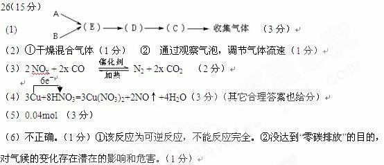 60、(哈师大附中、东北师大附中、辽宁省实验中学2010年高三一模,26)汽车尾气的主要成分为CO2及CO、NOX(NO和NO2)的混合物,其中NO的体积分数占95%以上)等。治理方法之一是在汽车排气管上加装“催化转换器”,利用催化剂使CO和NOX发生反应大部分转化为CO2和N2。某小组在实验室利用下图所示装置模拟汽车尾气处理中CO和NOX的反应并测量反应后混合气体的组成。(已知