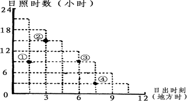 下图是不同地点6月22日的日出时刻与日照时数之间的关系。读图回答4-5题。![]()