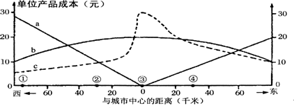 读某工业部门在某城市及其附近地区土地、产品运输和劳动力成本曲线图(图7)。假设其中土地成本和运费都只与距城市中心的远近、交通通达度有关。据此回答17-18题。