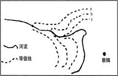 图为雅鲁藏布江地区的等值线分布示意图,其等值线的数值c>b>a,读图回答1 9-20题.