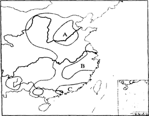 (3)ABC是我国三个干旱严重地区,但是三地区干旱形成的季节及原因不同,试分析说明B地区干旱形成的季节及原因 。(3分)