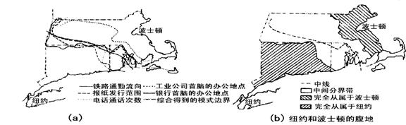 (1)a图表示格林选择不同的指标而得到的波士顿和纽约两城市对周围区域影响的范围差异。格林选择的五个主要单项指标有 。(3分)